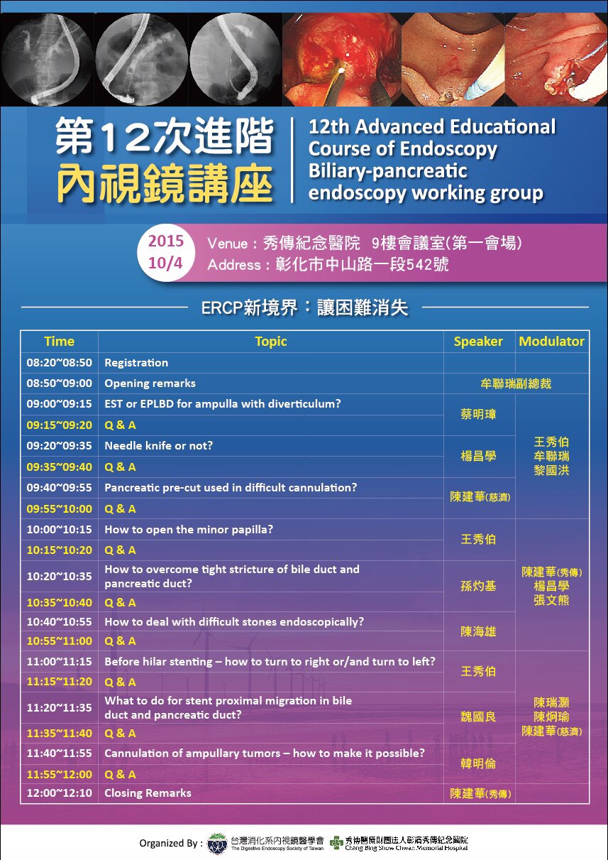 | 活動名稱: | 第十二次進階內視鏡講座-12th Advanced Educational Course of Endoscopy---Biliary-pancreatic endoscopy working group |