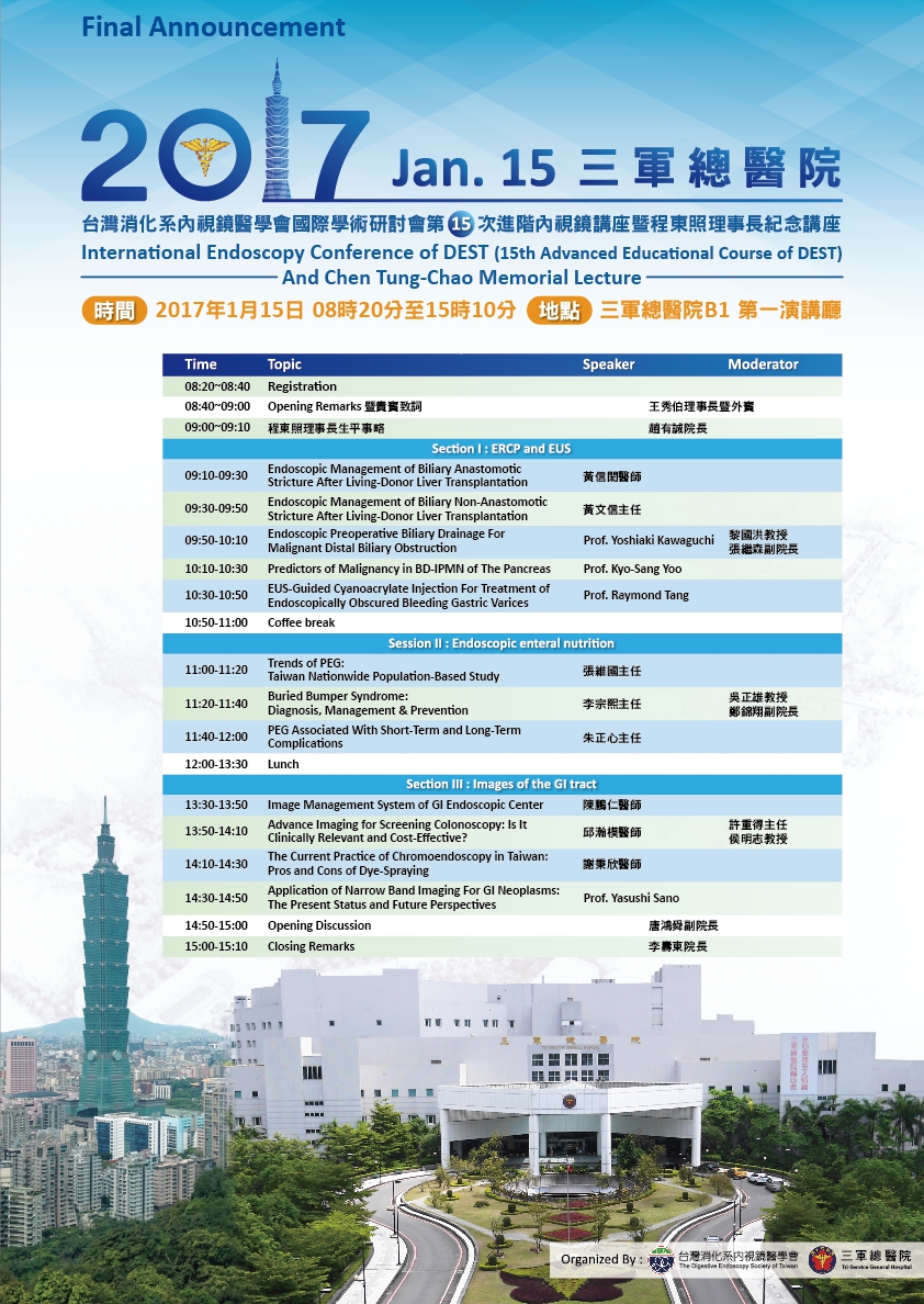 | 活動名稱: | 台灣消化系內視鏡醫學會國際學術研討會第15次進階內視鏡講座暨程東照理事長紀念講座 |