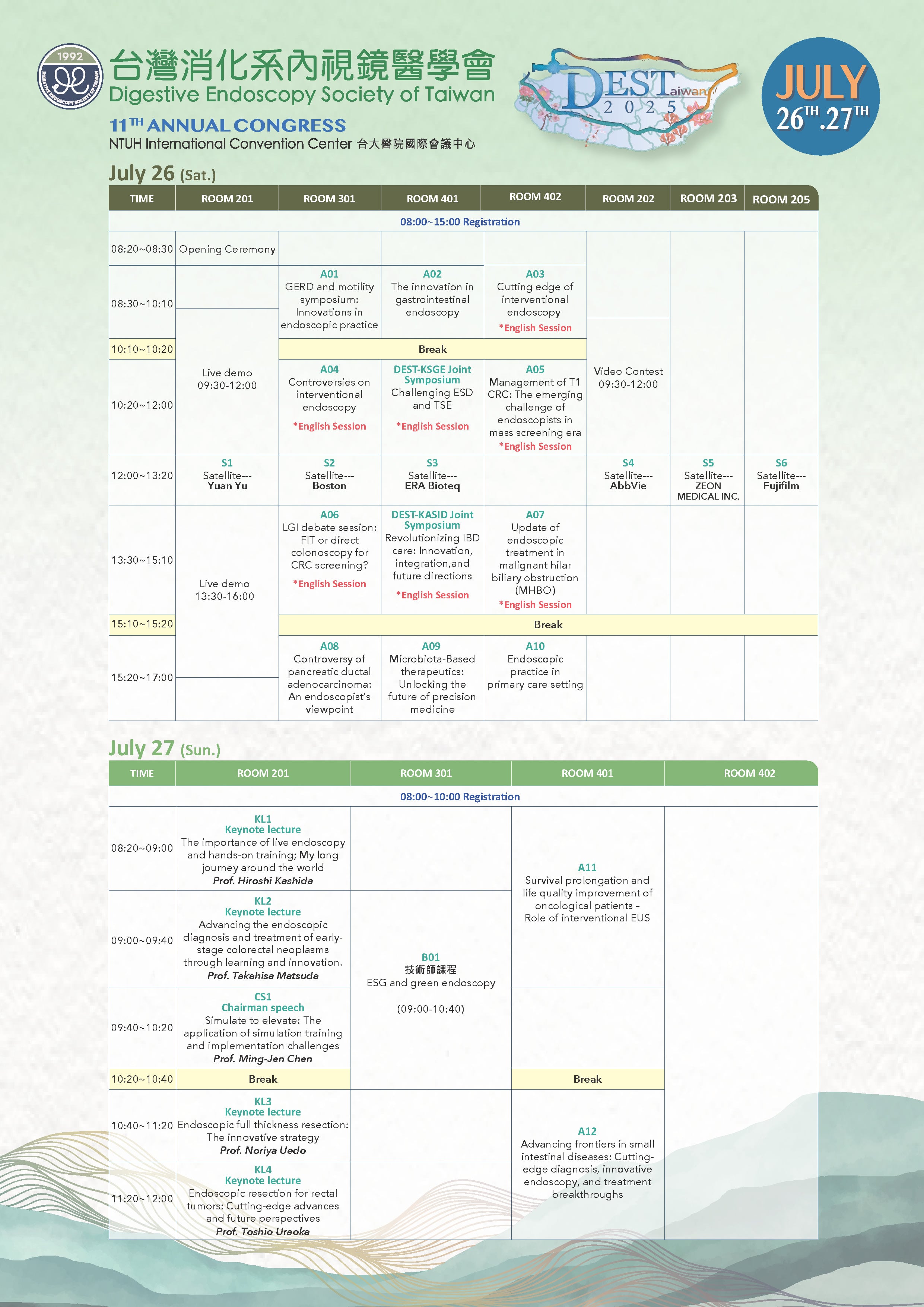 活動名稱: DEST 2025 活動日期: 2025/07/26 08:00 ~ 2025/07/26 17:00 參加人員名單 報名日期: 2025/07/26 00:00 - 2025/07/26 23:55 人數限制: 200 活動收費: X 主辦單位: 台灣消化系內視鏡醫學會 主講人: Prof. Noriya Uedo等 本會積分: 醫師A類 8 學分 活動地點: 台大醫院國際會議中心 檔案下載: 課程表 聯絡資訊: 返回