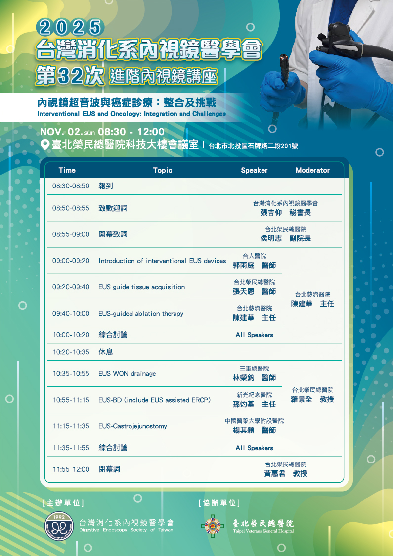 | 活動名稱: | 第32次進階內視鏡講座---內視鏡超音波與癌症診療:整合及挑戰 |