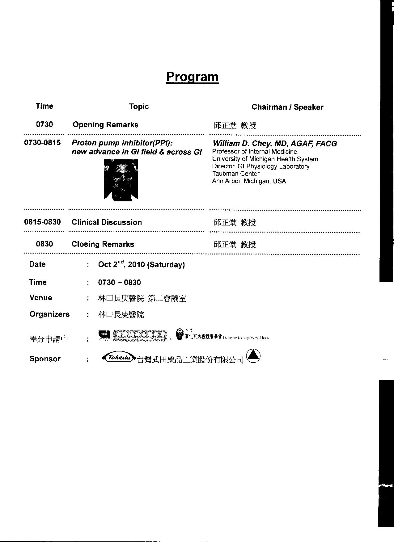 | 主講人: | William D. Chey | 本會積分: | 醫師B類 1 學分 |