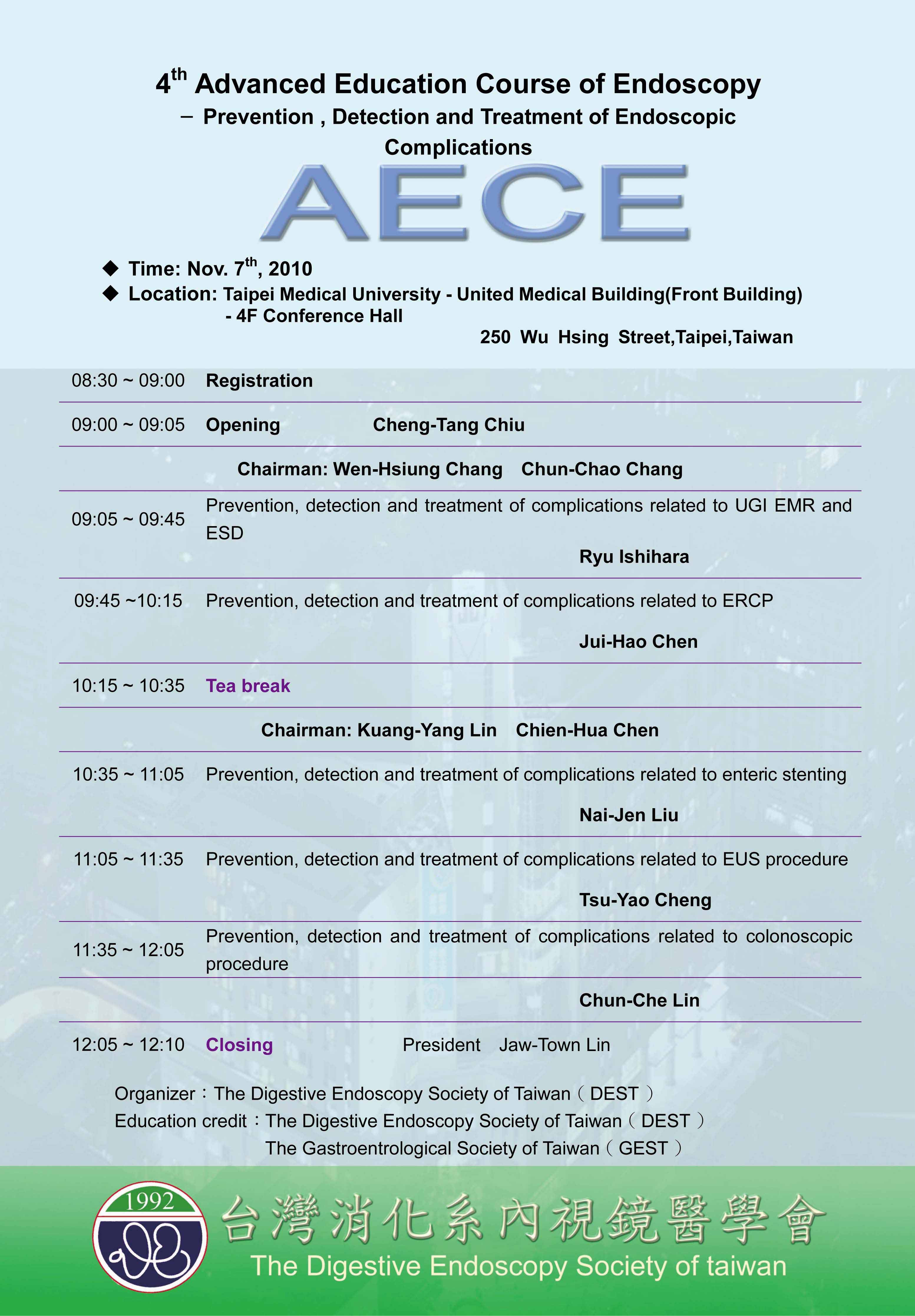 | 活動名稱: | 4th Advanced Education Course of Endoscopy-Prevention, Detection and Treatment of Endoscopic Complications |