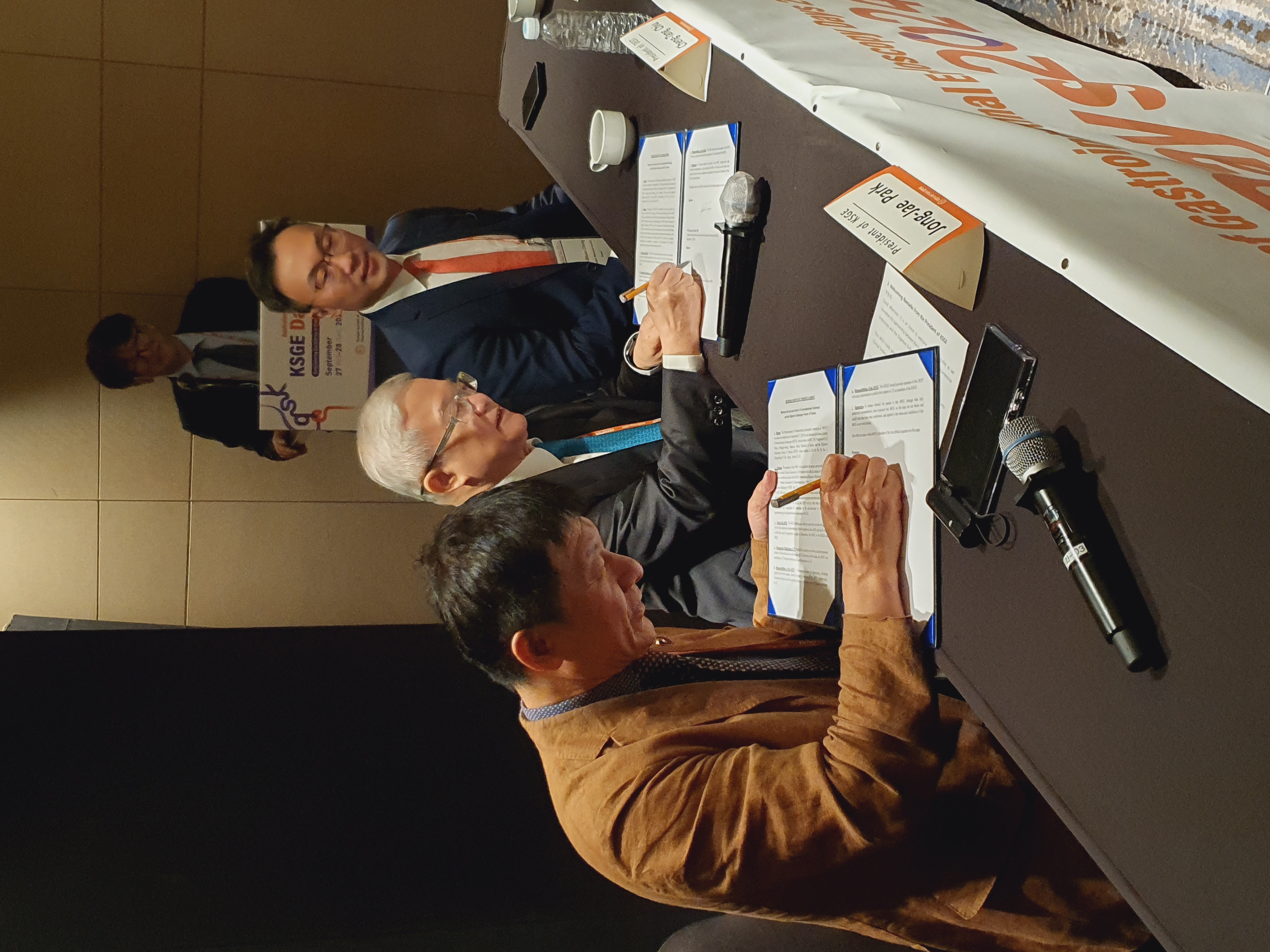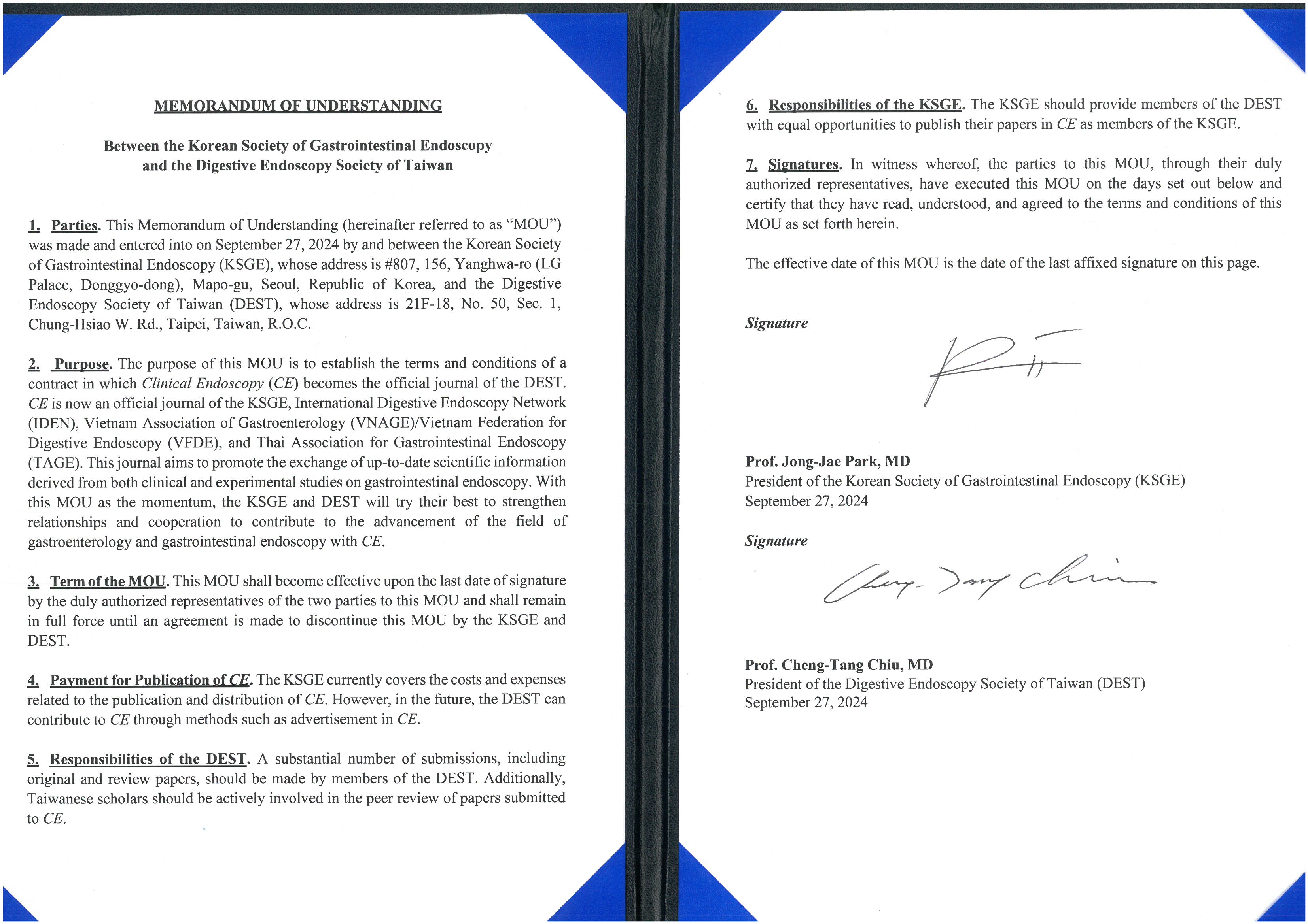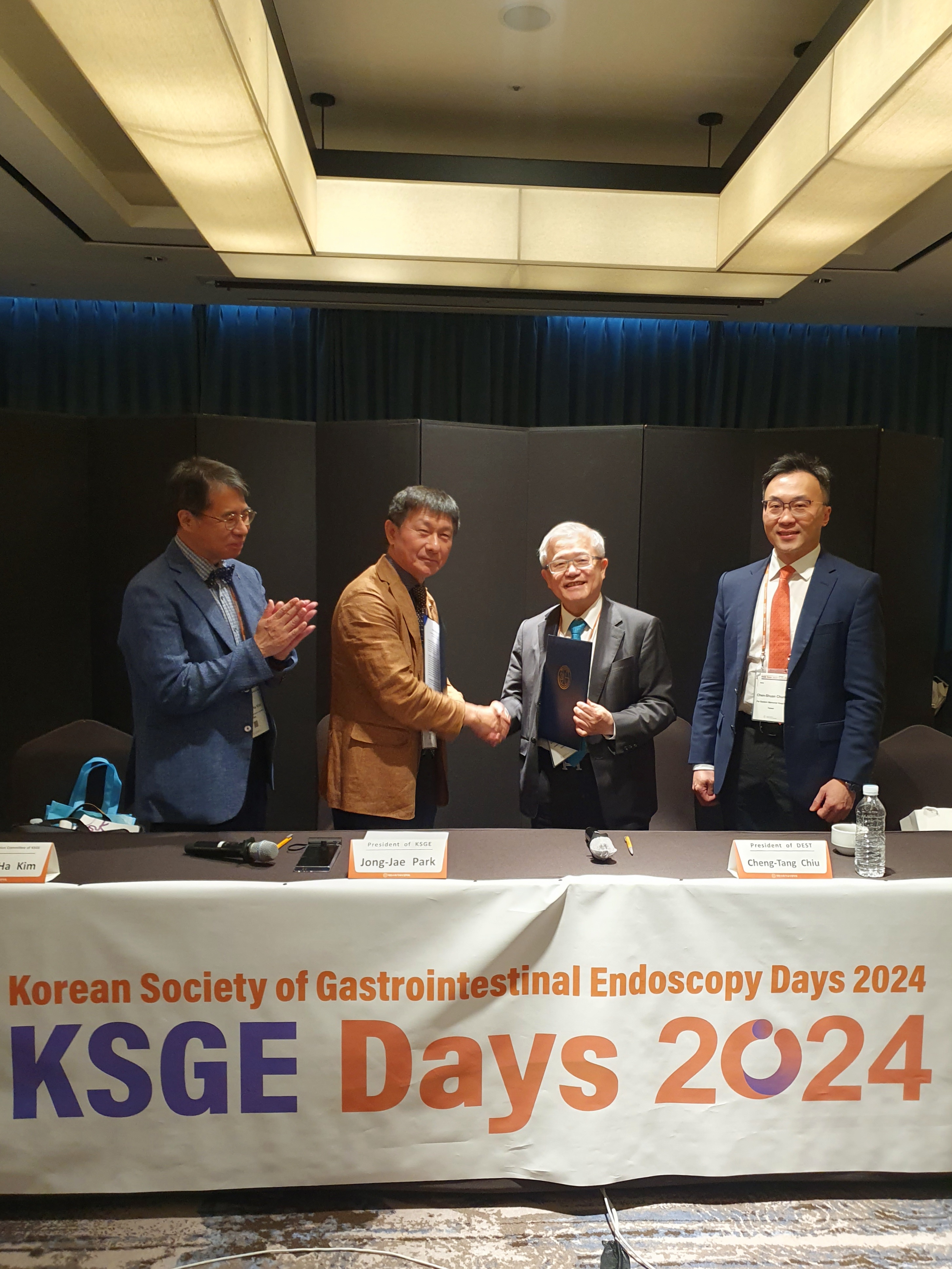 學會邱理事長正堂於9月27日,受邀參加韓國內視鏡醫學會(KSGE)在首爾舉辦的國際內視鏡大會,KSGE Days 2024,大會期間與KSGE締結為姊妹會,並且與KSGE理事長Park,Jong-Jae 教授,共同簽署期刊Clinical Endoscopy合作備忘錄,將本學會納入此期刊的成員(official journal)。敬邀會員與受訓醫師們踴躍投稿。
